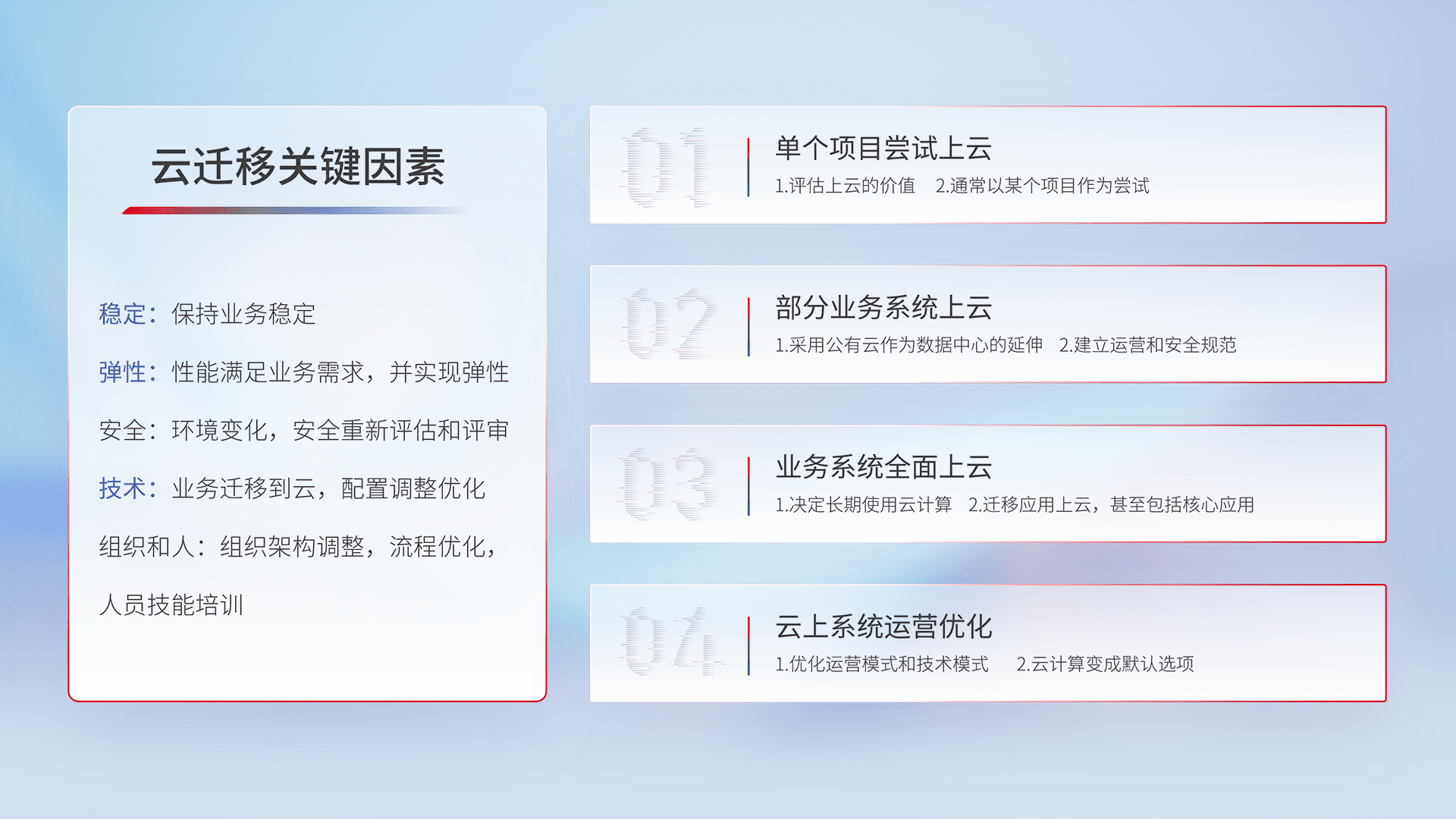 结合实际业务,,,从规划设计、、云平台选型、、、、云原生改造、、、数据迁移、、、、集成交付,,,迁移全过程为客户识别最佳上云路径,,,,做好风险识别管理,,设计网络架构、、、身份权限、、安全审计合规、、、操作审计、、日志审计、、、监控告警策略、、、、多站点容灾设计等,,对云上基础设施进行整体规划,,,提升IT治理水平,,,以满足弹性、、、、高可用、、高性能的需求。。。