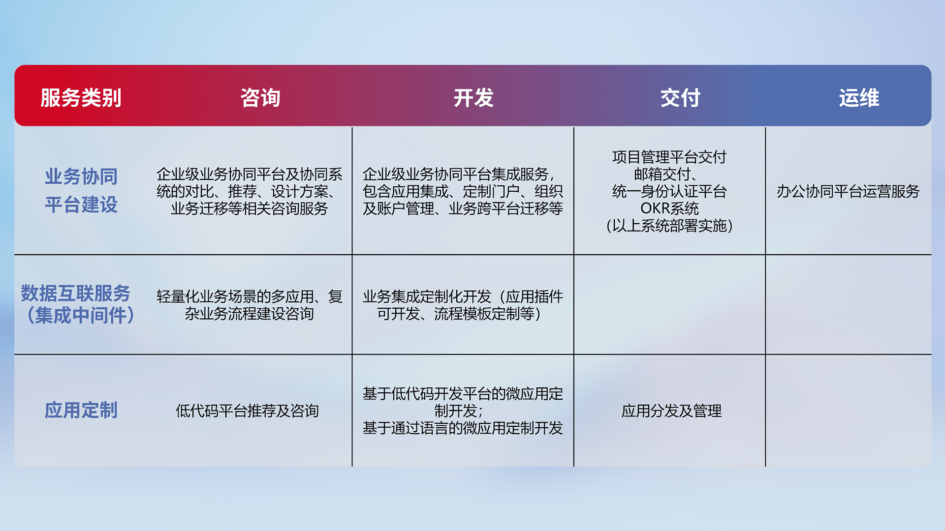 针对钉钉、、、企微、、、IDaas等平台级产品提供产品的规划、、、、方案、、、、交付、、、、定制化开发等服务,,,实现如统一协同办公、、、智能客户服务、、、、混合会议管理、、、智能数据查询、、、等业务场景,,实现数字化转型。。。